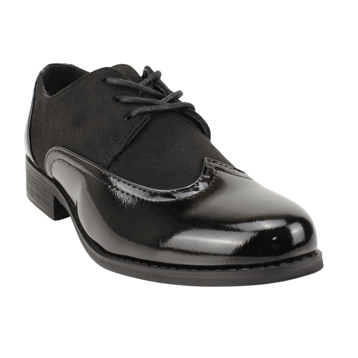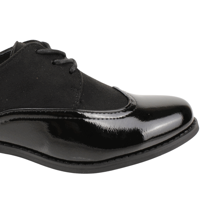 Zapato de Mujer New Walk color negro. Estilo Casual. Eleva tu estilo con la sofisticación atemporal de nuestros Zapatos Oxford en negro. Este diseño es la definición de la elegancia smart casual, perfecto para el trabajo, reuniones o cualquier evento donde la comodidad y el buen vestir son prioridad. El modelo en negro combina magistralmente dos texturas: la puntera, el talón y los detalles de las costuras están confeccionados en charol negro brillante, que aporta un toque lujoso y formal. El panel central y la lengüeta utilizan símil gamuza mate, creando un contraste visual muy atractivo y moderno. El corte clásico acordonado asegura un ajuste firme, y el tacón bajo estilo block ofrece una base sólida y cómoda para llevarlos todo el día. Son un básico esencial para crear looks andróginos y profesionales, combinando perfectamente con pantalones sastre o vestidos. Ajuste mediante cordones. Taco Cuadrado de 3 cm de altura y caña de 5,5 cm de alto.